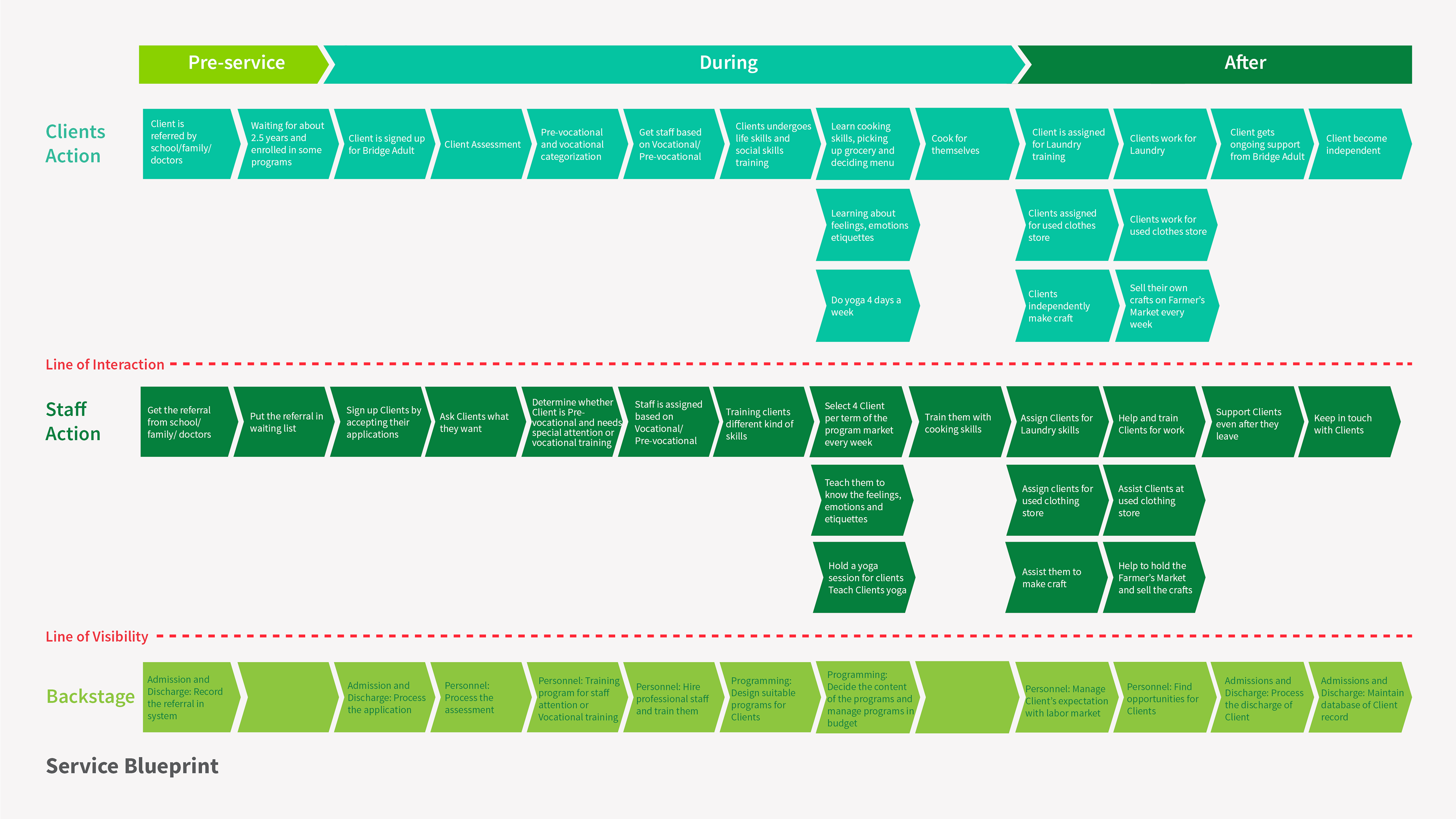 Jakob Schneider's "This is Service Design Thinking" was used to make a Blueprint for Bridge Adult Services. Blueprint allowed us to not only analyse the processes that are in the front end but also the processes happening at the back end. Client actions along the service delivery and corresponding staff action, categorized based on pre, during and after phases similar to Service Encounter Map, has been identified in below Blueprint.