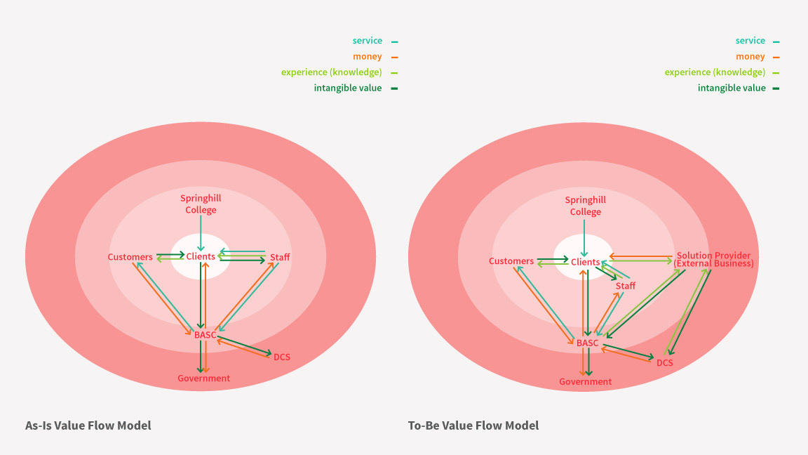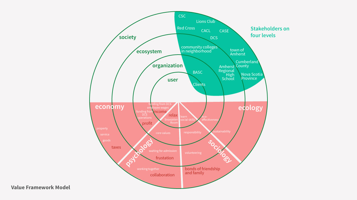 Elke Den Ouden's Value Framework Model from "Advanced Design Methods for social Innovation" was used to assess the value that was shared on four levels, namely Society, Ecosystem, Organization and User. The four perspectives used in the value framework model were economy, psychology, sociology and ecology.