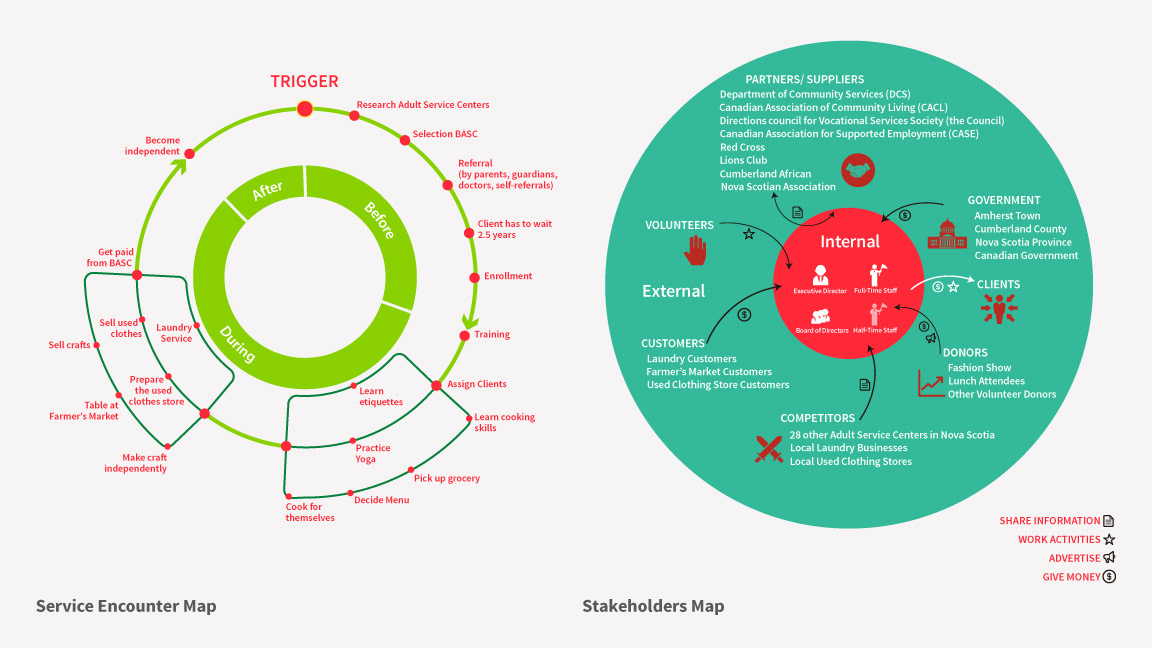 Service Encounter Map was used to take a closer look at interactions happening between Clients and Bridge Adult. When it came to programs and employments offered by Bridge Adult, Client had multiple options. Hence Service Encounter Map was modified to accomodate this.