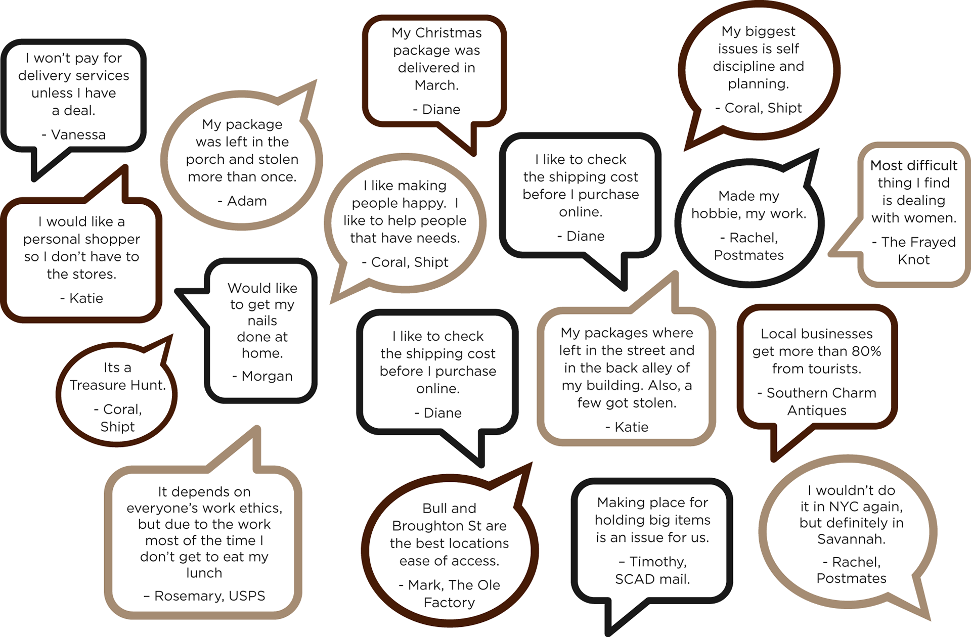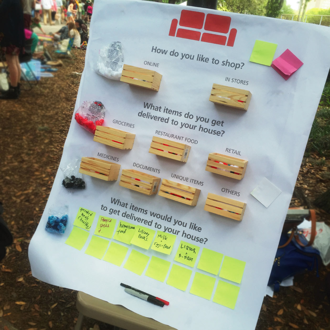 The questions provided in depth understanding of the experience people have during deliveries. We also asked people what they would like to get delivered. This provided us with opportunities for the future. The responses prompted us to think of how we might question to improve the experiences people have.