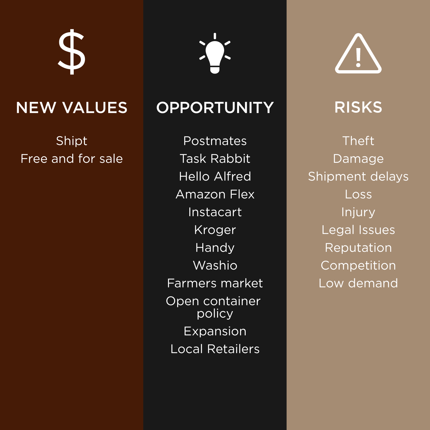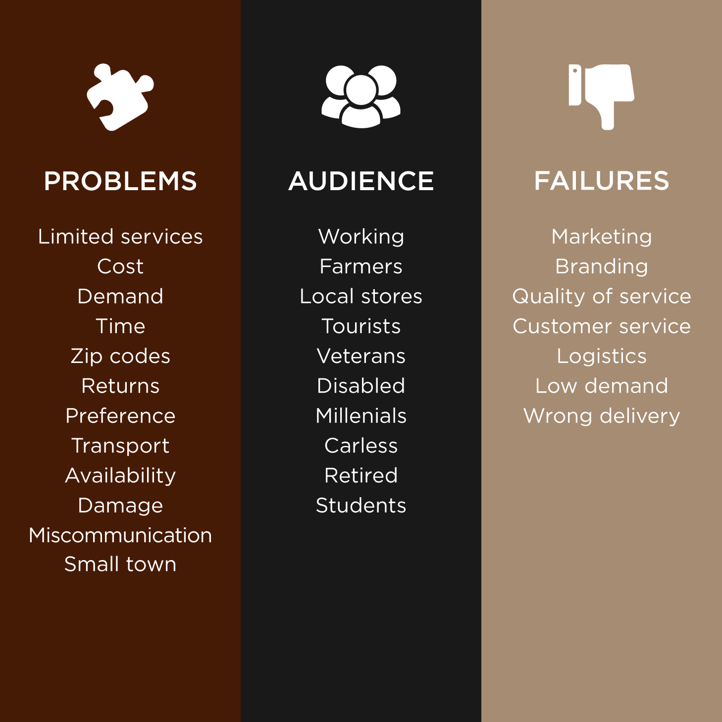 After combining data from our secondary as well as primary research, three opportunities were evidently visible. We had reached out to three types of people involved in our topic; sellers, customers and deliverers.