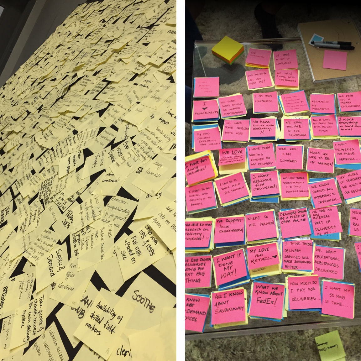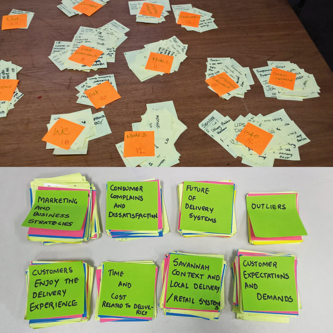 During the second method of affinitizing, we sorted all the yellow Post-its into 120 blue Post-its. Then we categorized them into 48 Pink which were then finalized into 8 Green Post-it categories.