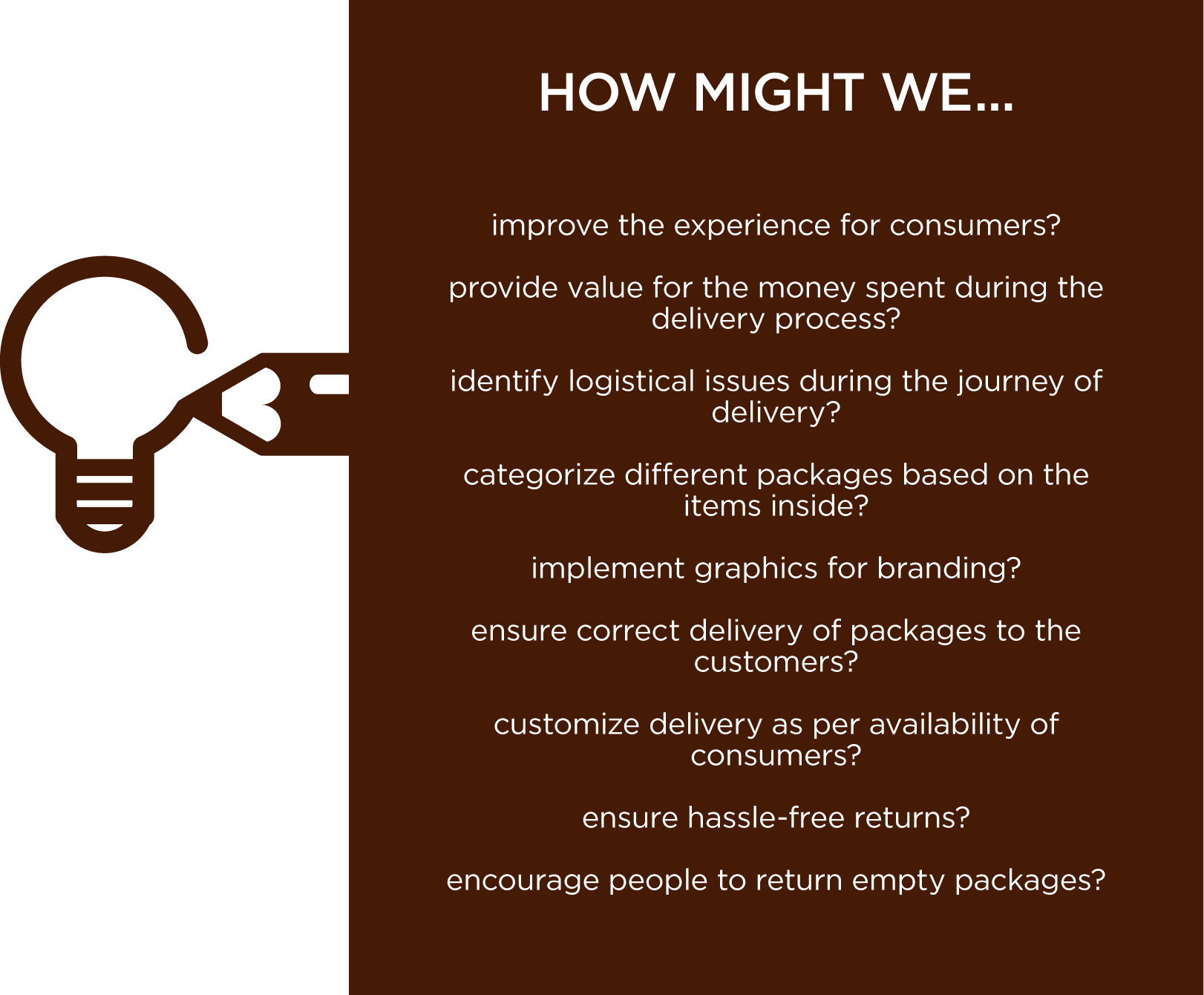 With heroic optimism we have tried our best to solve problems faced by customers to improve the deliveries. This involved some system improvements for the deliverers making the process even easier. Our focus was on three major points: Experience, Cost and Logistical issues. We tried to solve the issues asking ourselves “How Might We” ...