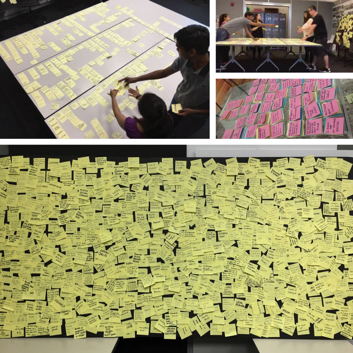 We had about 700 data points that we wrote down on yellow Post-it notes. During the first method of affinitizing, we followed a silent sorting method. Nobody influenced anyone which gave rise to some fresh categories.