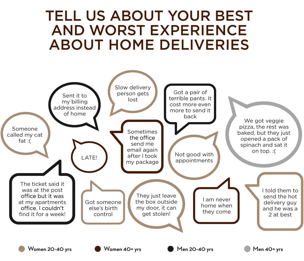 Mostly people have negative experiences regarding their deliveries. These often include delays, loss of packages, leaving packages unattended when the customers are not at home and false delivery calls.