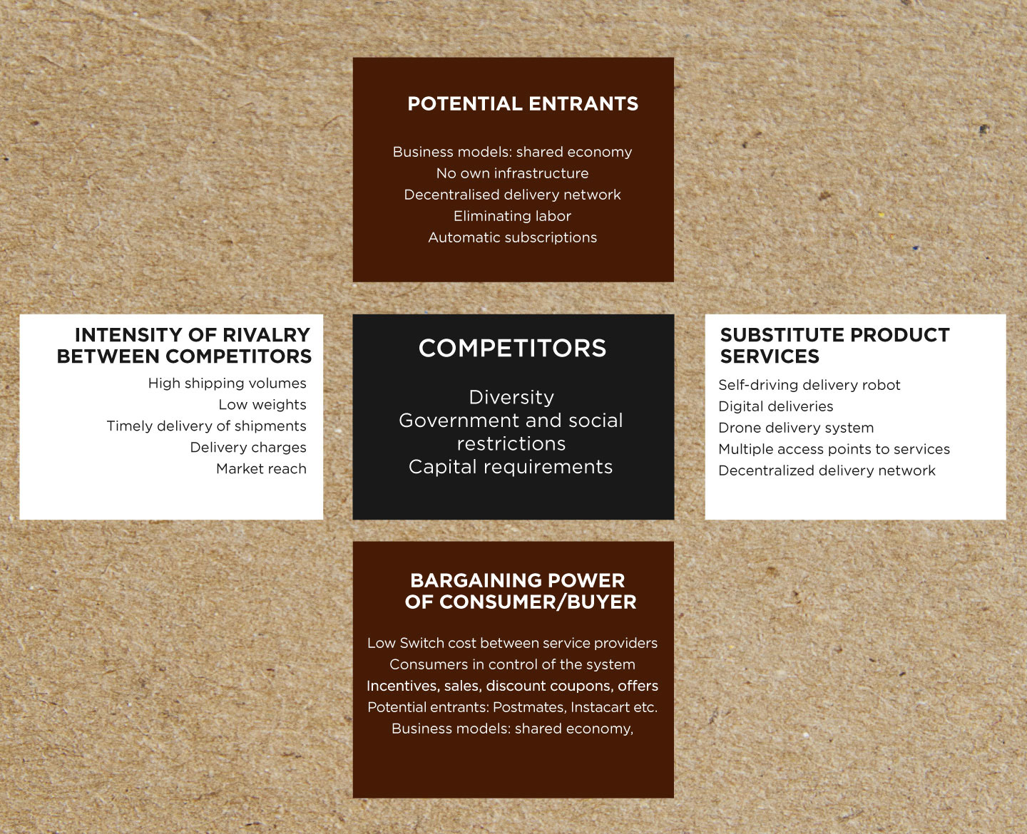 We gathered information about the delivery services existing in the United States, reviewed the information we had to identify them with the Five Forces mentioned above. Then we assessed the impact of each force on the industry.