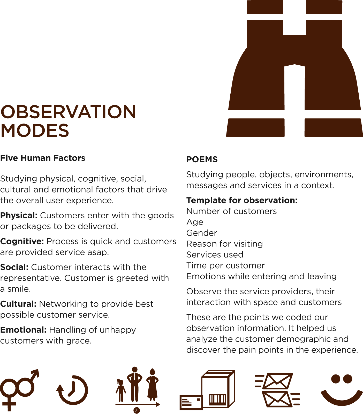 The first step of our primary research was Observation. We did observation at three locations: FedEx store at Broughton Street, USPS store at Fahm Street and UPS store at East Bryan Street. For this we adopted the Fly on the Wall technique. Customer activities were not influenced by our presence. This provided us with pure statistics. We looked at the infrastructure and daily operations of the organization. The critical part of the process was the manner of attending to a customer, which affected the time taken per person.