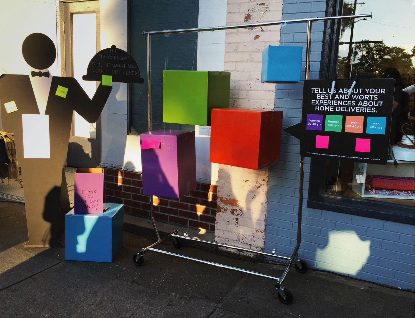 For the second cultural probe we wanted to know about the experiences people have had in receiving or sending deliveries. The design used the artifacts related to delivery services and the butler denoted comfort in the act of delivery. To humanize the design, we created a silhouette of a butler with a cloche asking people how he could help them. He represented on demand services all round the clock that could be available to people. The other part of the design was a moving rack with boxes hanging which denoted the targeted audience, for example categorization as per age and gender.