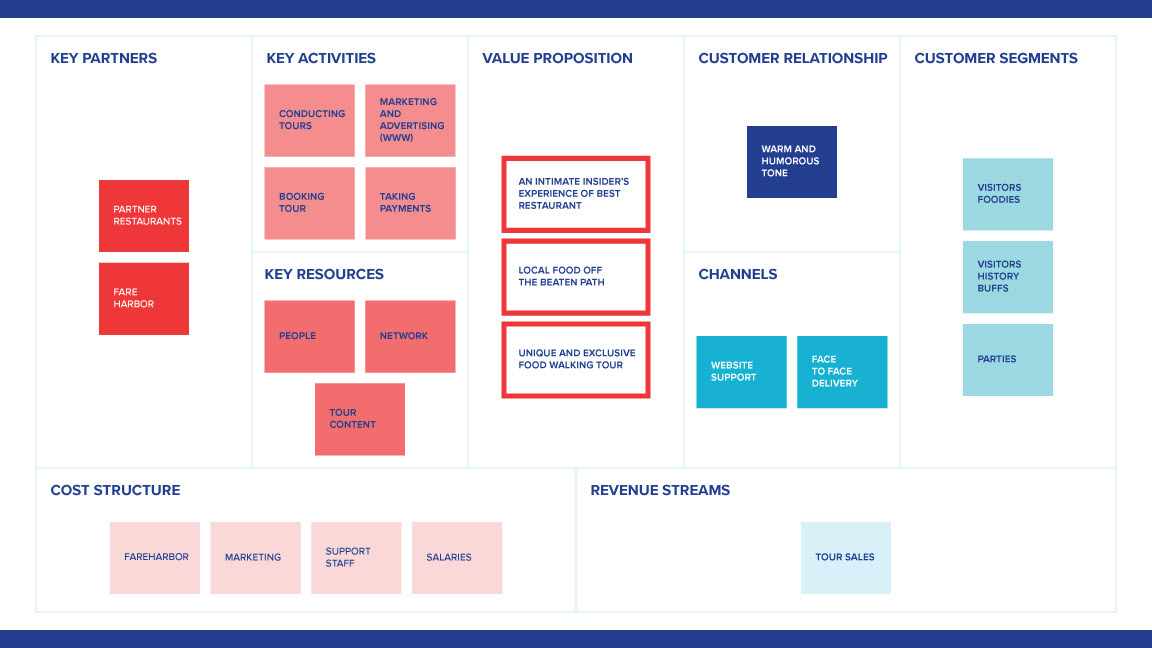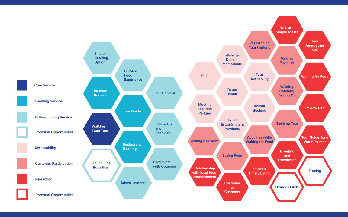 Enabling services show essential services supporting core service and differentiating services are the unique services below which separates Savannah Taste Experience from competitors.