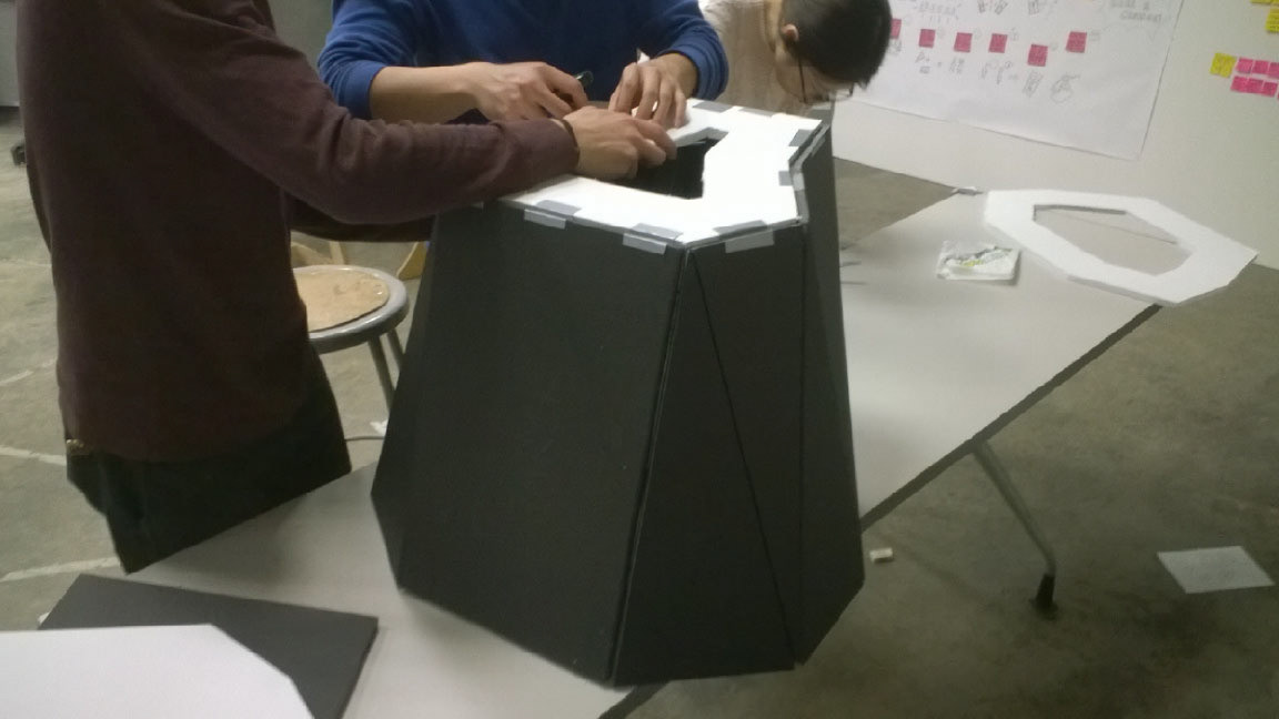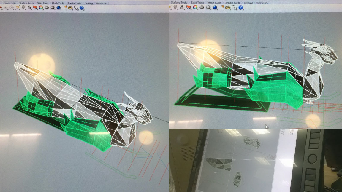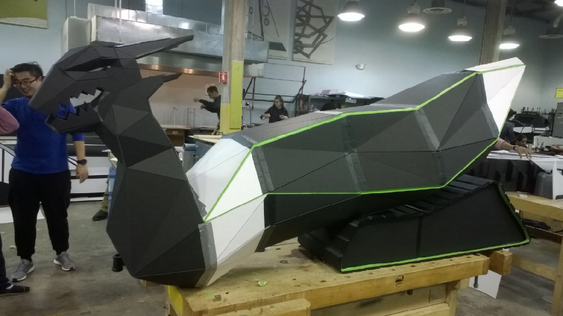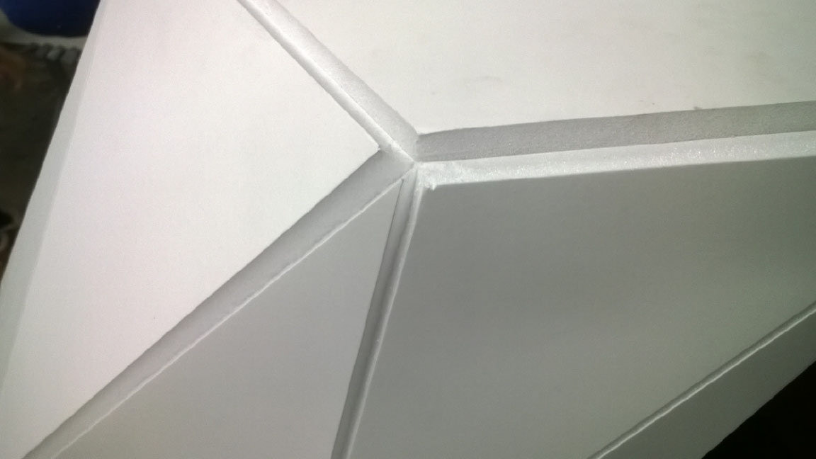 After unfolding Rhino model into a flat sketch, we created patterns for foam core. After cutting foam core patterns, we started building one section at a time.